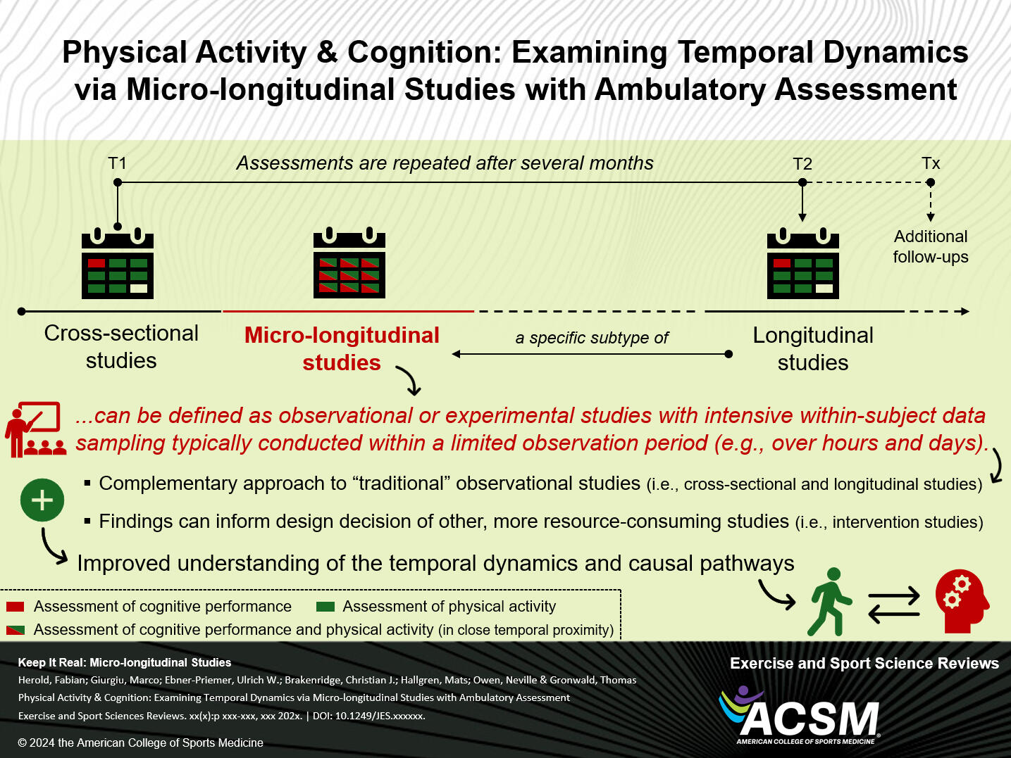 In our new „Perspectives for Progress“ article in „Exercise & Sports Science Reviews“ we highlight in particular the advantages of examining temporal dynamics with ambulatory data assessments via micro-longitudinal studies - using the example of the emerging field of physical activity and cognition.This study approach characterizes frequent within-subject real-life-embedded assessment methods of exposure(s) and outcome(s) in relatively short periods. In addition to the utility to address outstanding research questions, micro-longitudinal studies with ambulatory assessments are also well-situated to complement the evidence obtained from traditional study approaches by strengthening the capacity for causal inferences via a methodological and/or data triangulation, and better informing more resource-intensive, causality-confirming study approaches.In our specific research, we are particularly interested in contextual information necessary to interpret, e.g., psycho-physiological wearable monitoring data (with potential large day-to-day variation and multiple confounding factors), which can be implemented very well within this methodological study approach.Compared to highly controlled intervention studies (e.g., randomized controlled trials), observational studies (e.g., longitudinal studies) provide the key advantages that they are typically (1) less resource-consuming and expensive, (2) have less restrictive exclusion criteria, which strengthens the representability and generalizability with high ecological validity, and (3) less prone to expectancy bias as no intervention is offered. The full text can be requested via Research Gate.