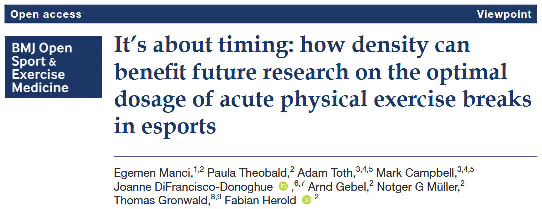 In this viewpoint article we propose that traditional concepts of exercise prescription and dosage determination using the variables frequency, intensity, time (also referred to as duration) and type of physical exercise (ie, abbreviated with the acronym FITT) should be complemented by the variable density which characterises the timing of consecutive bouts of acute physical exercise during an esports session.