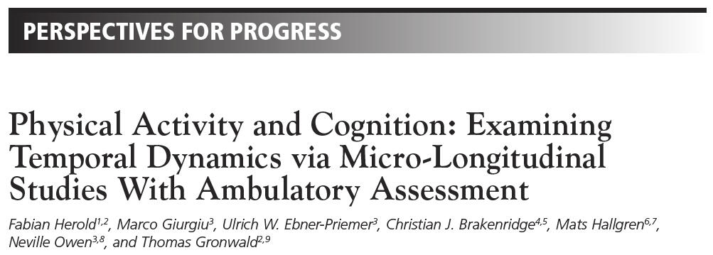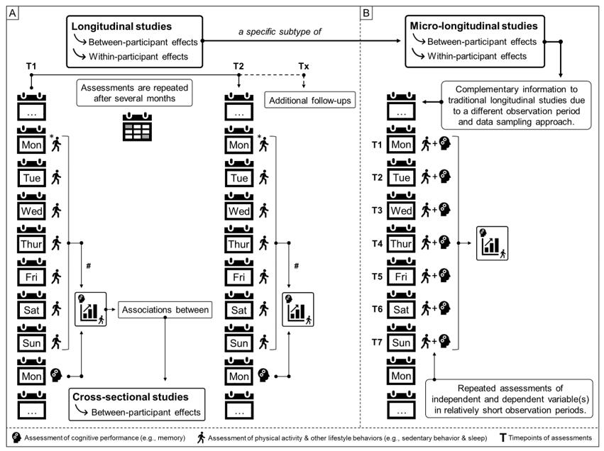 In our new „Perspectives for Progress“ article in „Exercise & Sports Science Reviews“ we highlight in particular the advantages of examining temporal dynamics with ambulatory data assessments via micro-longitudinal studies - using the example of the emerging field of physical activity and cognition.This study approach characterizes frequent within-subject real-life-embedded assessment methods of exposure(s) and outcome(s) in relatively short periods. In addition to the utility to address outstanding research questions, micro-longitudinal studies with ambulatory assessments are also well-situated to complement the evidence obtained from traditional study approaches by strengthening the capacity for causal inferences via a methodological and/or data triangulation, and better informing more resource-intensive, causality-confirming study approaches.In our specific research, we are particularly interested in contextual information necessary to interpret, e.g., psycho-physiological wearable monitoring data (with potential large day-to-day variation and multiple confounding factors), which can be implemented very well within this methodological study approach.Compared to highly controlled intervention studies (e.g., randomized controlled trials), observational studies (e.g., longitudinal studies) provide the key advantages that they are typically (1) less resource-consuming and expensive, (2) have less restrictive exclusion criteria, which strengthens the representability and generalizability with high ecological validity, and (3) less prone to expectancy bias as no intervention is offered. The full text can be requested via Research Gate.