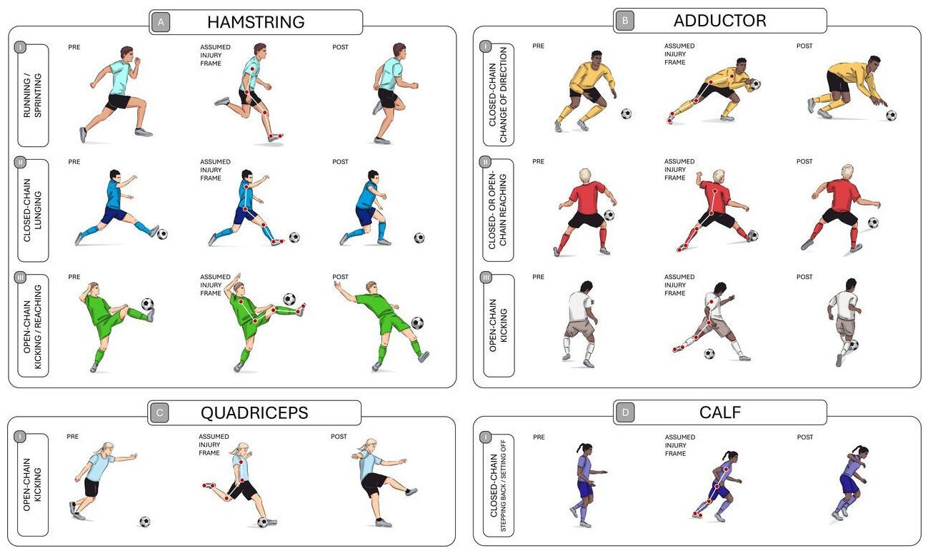Illustrations of situational patterns for indirect and non-contact muscle injuries (muscle strains). Please note that only a selection of the most common injury patterns based on included studies is illustrated (acknowledge the predominance of studies investigating male football players).A-I. Hamstring (running/sprinting): Hamstring injuries are frequently seen during high-speed running or acceleration phases. Modelling studies and case reports identified the open-chain late swing phase as being most vulnerable to injury. During this phase of the gait cycle, the muscle-tendon unit of the biceps femoris lengthens. However, confirmation of this finding appraising systematic real-world video data is yet to be done, and the specific running phase in which athletes are most vulnerable to hamstring injury remains a matter of debate.A-II. Hamstring (closed kinetic chain lunging injury pattern): The athlete performs a decelerating closed kinetic chain maneuver. At the assumed time of injury, the knee joint is close to full extension, the hip joint is in a flexed position (that is, lunging position). In the illustrated example, the trunk position is neutral (in reference to the earth horizontal) but varying trunk positions have been reported to be present at the assumed time of injury.A-III. Hamstring (open-chain kicking or reaching injury pattern): Open-chain injury patterns are typically observed during kicking or reaching maneuvers. Injury kinematics comprise a flexed hip joint combined with an extending knee joint movement. These injuries have been traditionally considered as overstretching injuries with the muscle-tendon unit being lengthened past its limit.B-I. Adductor (closed-chain change of direction injury pattern): Changes of directions are common situational patterns for adductor muscle injuries. The athlete performs a change of direction to catch a ball opposite to the moving direction. At the assumed time of injury, the injured leg is abducted and externally rotated while the adductor muscles are simultaneously activated to perform the deceleration and change of direction manoeuvre.B-II. Adductor (closed- or open-chain reaching injury pattern): The athlete performs a reaching manoeuvre with the non-injured leg towards the ball. At the assumed time of injury, the adductor muscle-tendon unit of the injury leg is lengthening due to hip extension, hip abduction and hip external rotation.B-III. Adductor (open-chain kicking injury pattern): This injury pattern shows similar injury kinematics (including hip abduction and external rotation) but is an open-chain injury pattern due to the player’s intention of kicking a ball with the injury-sided leg.C-I. Quadriceps (open-chain kicking injury pattern): A common observed injury kinematic of quadriceps injuries comprise a flexing hip joint and extending knee joint movement (that is, kicking manoeuvre).D-I. Calf (closed-chain stepping back injury pattern): In the illustrated example, the athlete is setting of to take a run (e.g., by performing a back-step manoeuvre). These manoeuvres are not only seen in running or football but are common in racquet sports (leading gastrocnemius muscle injury to be named “tennis leg”) or basketball. The underlying joint movements are ankle dorsiflexion and knee extension, thereby lengthening the calf muscle tendon unit. At the assumed time of injury, the knee is close to full extension, the ankle in more than 10° dorsiflexion, and the foot in external rotation.