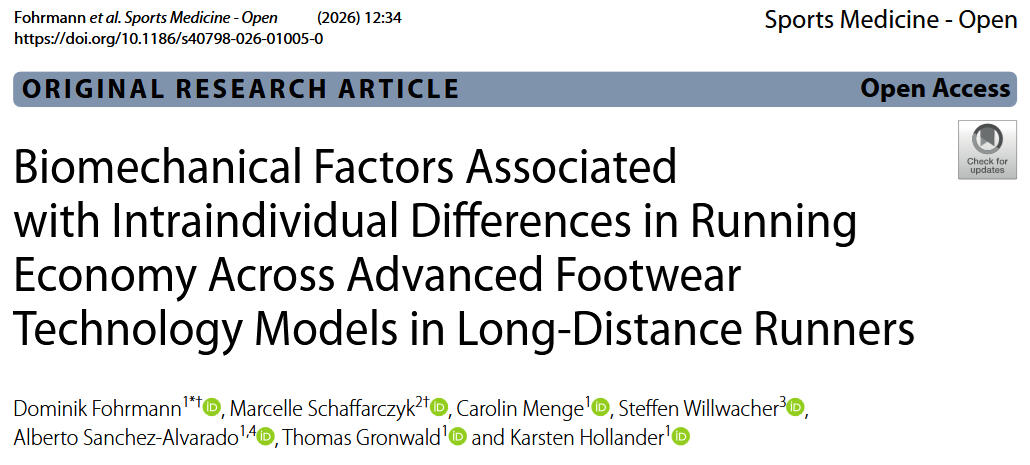 In our new study we investigated how biomechanical factors influence differences in running economy when athletes use various advanced footwear technologies (AFT). In a controlled crossover experiment, trained long-distance runners tested three high-performance shoe models while their energy expenditure and movement patterns were analyzed.The results showed that shorter ground contact time was consistently associated with improved running economy, meaning runners used less energy at the same speed. However, no single shoe model proved superior overall, highlighting that performance benefits depend on the interaction between an individual runner’s biomechanics and the specific footwear.Overall, the findings suggest that optimizing running performance requires personalized shoe selection rather than relying on one universally “best” model.